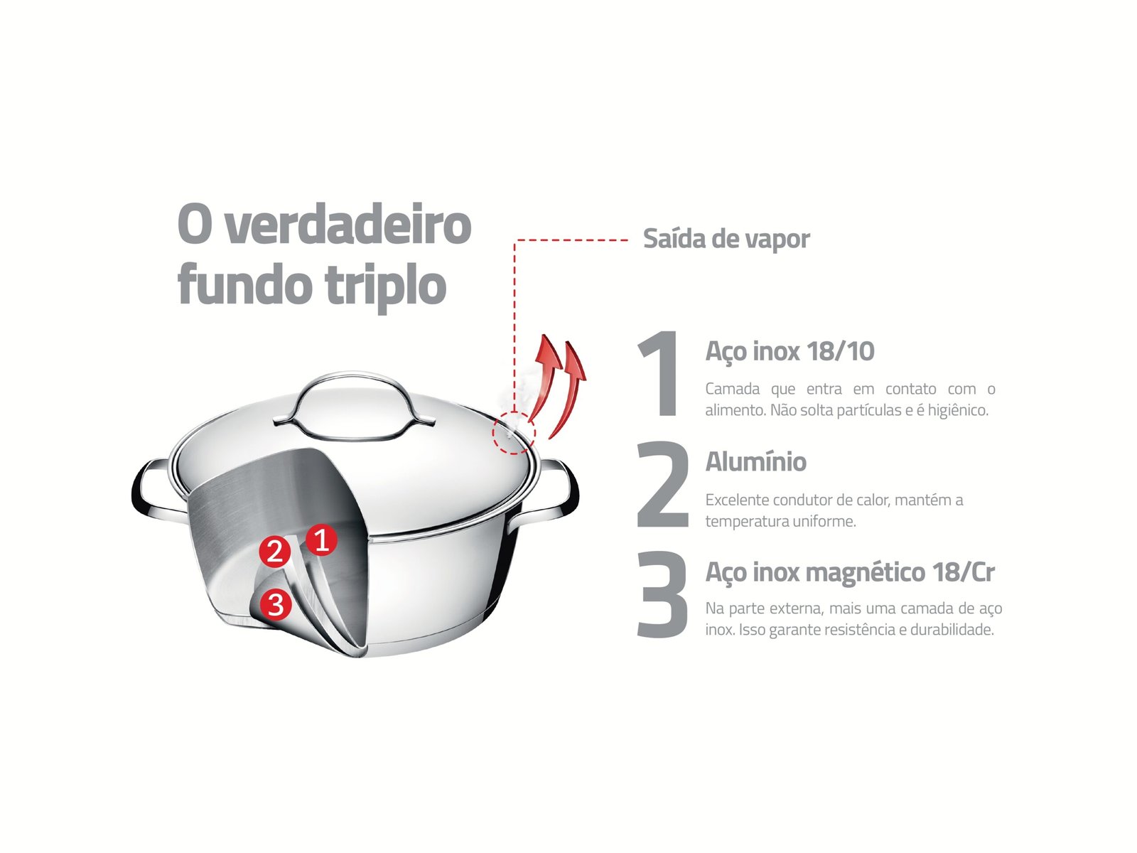 Mais saudável: por ser feito de aço inoxidável, o caldeirão Tramontina não libera nenhum tipo de resíduo nas suas receitas. Fácil de usar: um caldeirão prático para todas as suas receitas e que faz bonito em qualquer tipo de fogão: gás, elétrico, vitrocerâmico e indução. Ainda possui tampa com saída de vapor e encaixe perfeito. Mais durável: o inox Tramontina é uma matéria-prima nobre, resistente e que vai fazer bonito por muito mais tempo na cozinha. Economiza tempo e energia: o segredo está no fundo triplo (aço inox + alumínio + aço inox), que distribui o calor uniformemente, proporcionando um cozimento mais rápido. Por isso, você pode manter o fogo baixo durante todo o preparo e, assim, poupar energia. Além disso, o caldeirão toda em aço inox pode ir ao forno para gratinar ou finalizar pratos, na temperatura máxima de 260°C. Fácil de limpar: deixar seu caldeirão brilhando é simples, você só precisa de água, sabão e uma esponja macia. Se preferir, é só colocar na máquina de lavar.