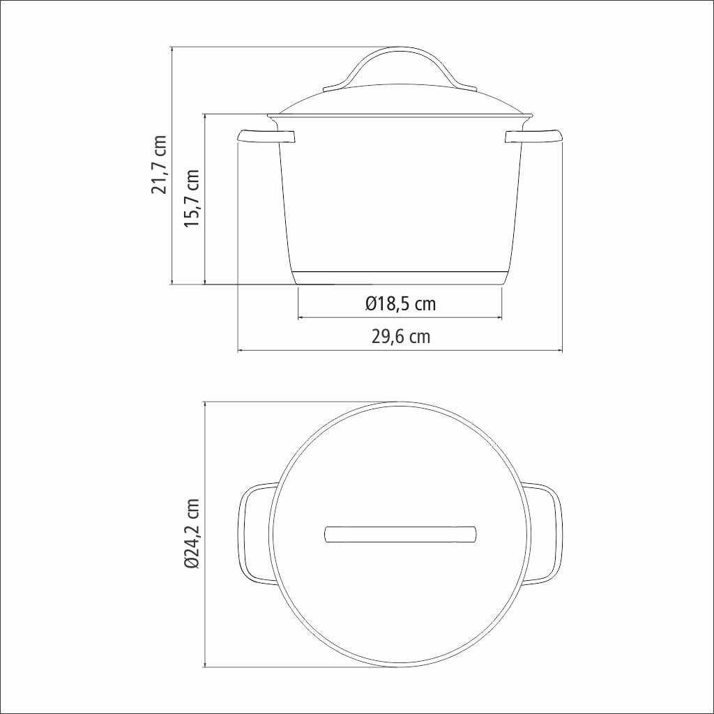 Corpo de alumínio com espessura que proporciona cozimento rápido e uniforme. Revestimento interno e externo de antiaderente Starflon Premium que