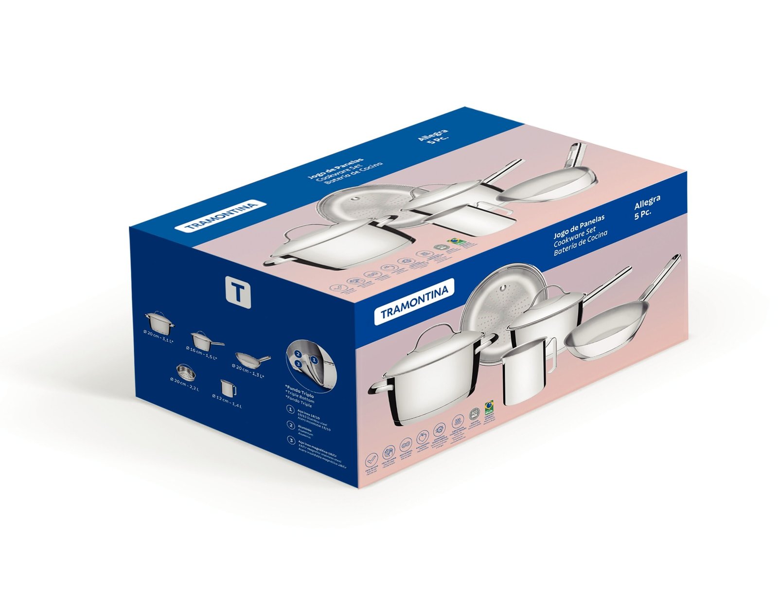 Tenha produtos práticos e diferenciados na sua cozinha. O Jogo de Panelas Tramontina Allegra em Aço Inox com Fundo Triplo 5 Peças facilita seu dia-a-dia e ainda embeleza sua cozinha. São 5 peças com design moderno que dá um toque cheio de estilo ao ambiente. Elas ainda apresentam tecnologia de fundo triplo (aço inox + alumínio + aço inox), distribuindo melhor o calor, proporcionando um cozimento mais rápido e uniforme. E o melhor, economizando mais energia! São totalmente produzidas em aço inox, material que atesta alta durabilidade e bom gosto. Acompanham tampa com saída de vapor e são ainda muito fáceis de limpar. Podendo ser lavadas diariamente na máquina de lavar louças Elas ainda impressionam pela versatilidade, podendo ser usadas em diferentes tipos de fogões.